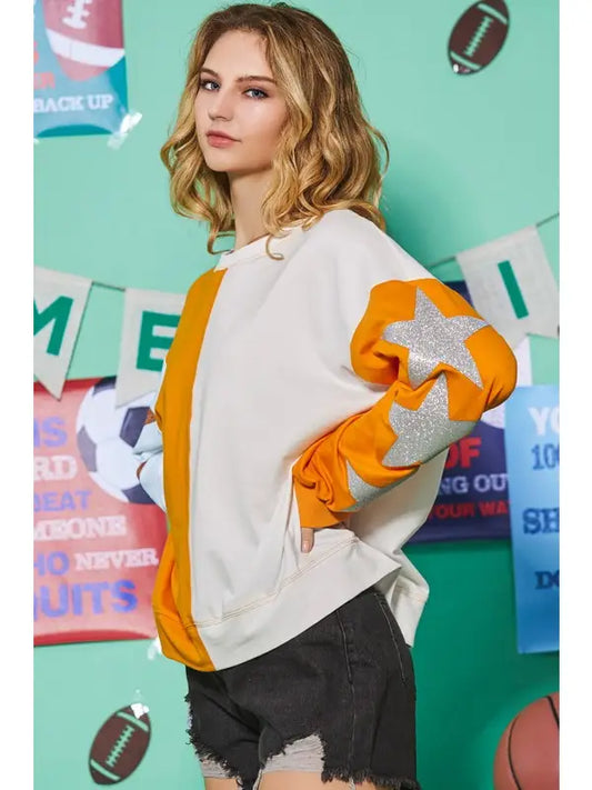Orange and White Color Block Glitter Star Sweatshirt